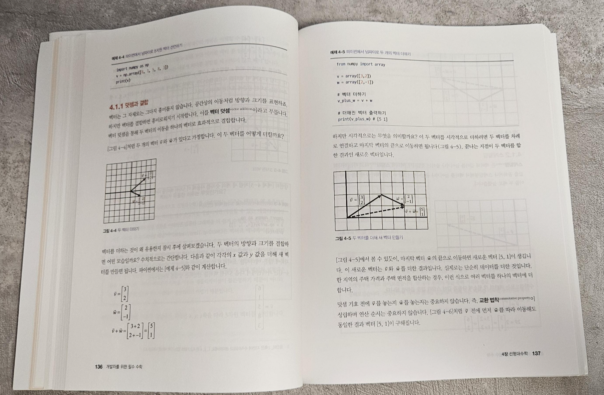 고유벡터와 고유값, 역행렬 등등.. 다양한 기초 수학을 넘어 뒷부분으로 갈 수록 데이터 과학에 필요한 선형대수 계산, 회귀, 분류, 신경망 챕터가 존재한다. 그림과 예제, 코드들이 보기 쉽게 만들어져 이해를 도왔다.