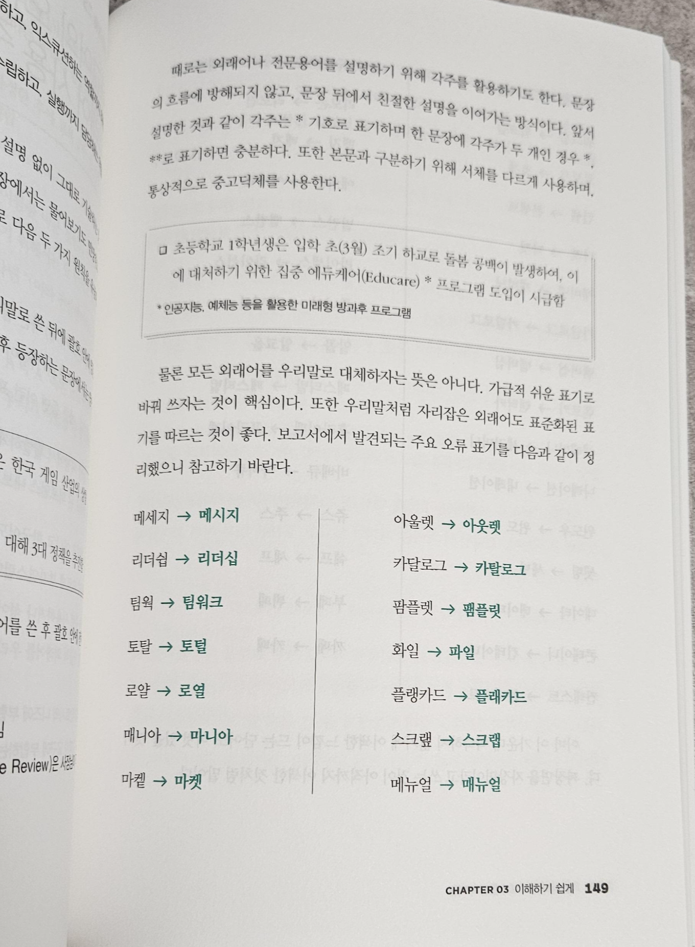 (뒷장에도 나와있는데 나도 몇가지 틀리게 사용했던게 있다. 하지만 개인적인 생각으로 읽는 사람도 모르지 않을까...라는 안일한 생각을 버리고 수정하도록 해야겠다.)